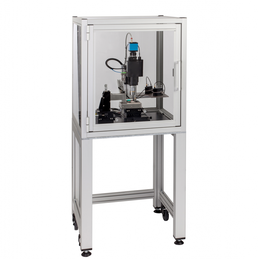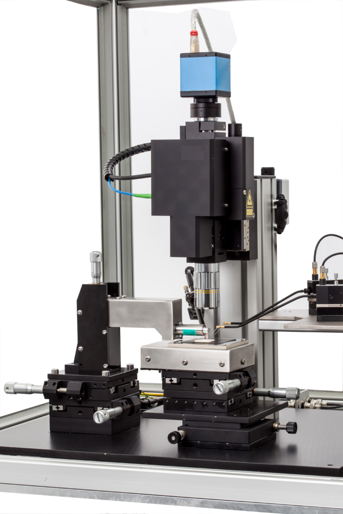 Multilayer, 1-Kristallsystem oder Bulkmaterialien können elektrisch und mechanisch kontaktiert werden. Dies ermöglicht die Charakterisierung von Bulkmaterialien mit Top- und Bottom-Kontakten mit Anregespannung von bis zu 10 kV. Die standardmäßige Heizkammer mit einem Temperaturbereich von RT bis 200 °C, kann auf -40 °C bis 200 °C erweitert werden. Die Temperatur wird hier über ein gefedertes Thermoelement an der Oberfläche der Aktoren gemessen.