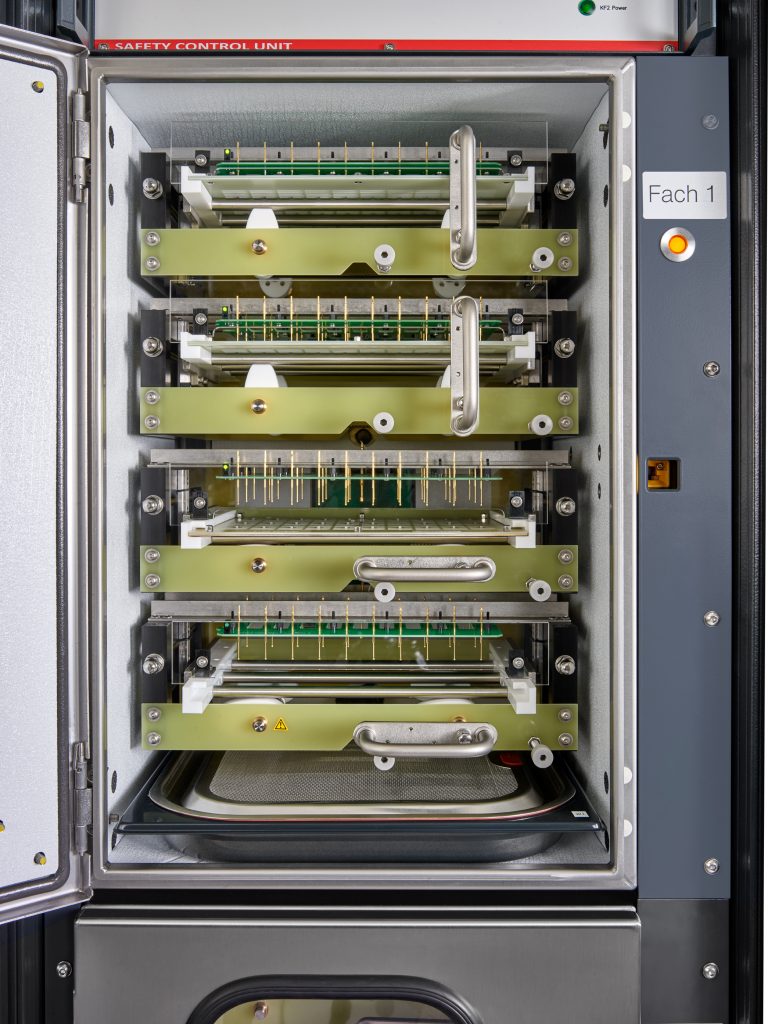 The CBS production tools consist of a loading and unloading measurement point, along with the climate chambers and associated measurement electronics. When fully equipped, our systems offer you eight small climate chambers, each with four magazines. In each compartment, the humidity is regulated separately via a passive system. This allows you to load and unload the compartments independently.